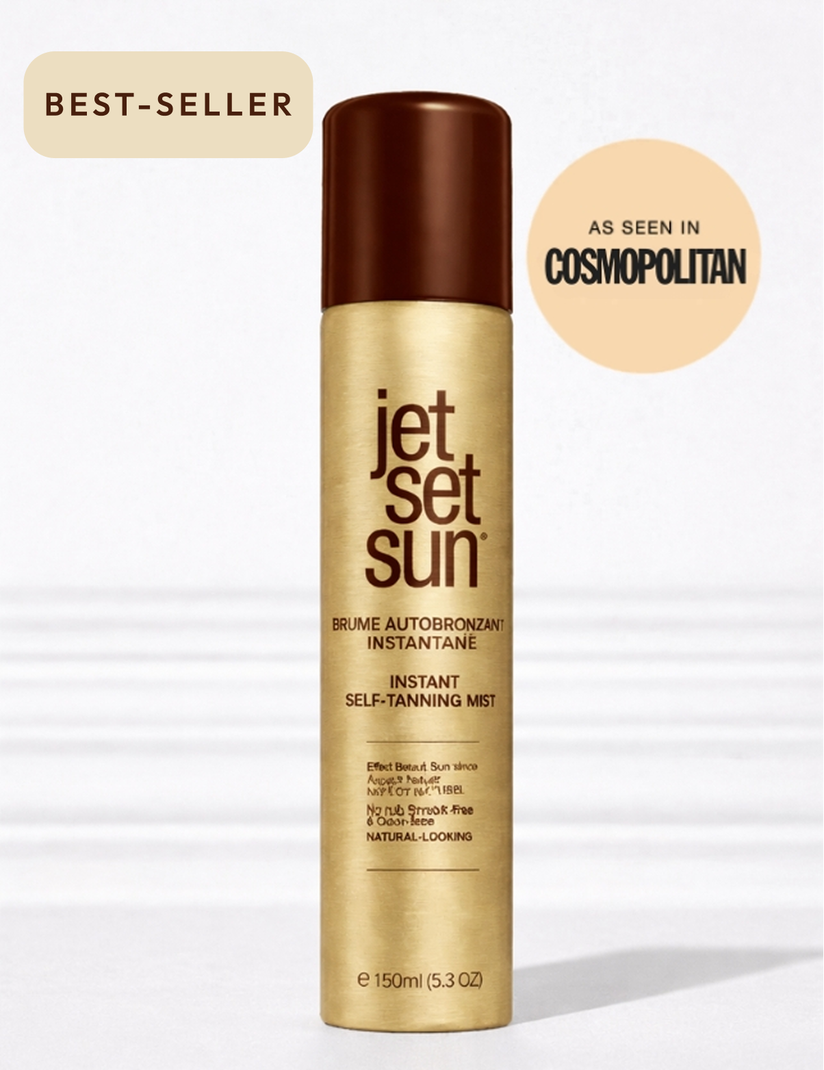 “Je suis absolument ravie de mon autobronzant Jet Set Sun, que j’utilise tous les matins depuis 2 ans. Ce spray est tout simplement génial : il ne laisse aucune trace, offre un teint hâlé parfaitement naturel et me vaut de nombreux compliments. On me demande souvent si je reviens de vacances, c’est dire ! En plus, il n’y a aucune odeur désagréable, et l’application est un jeu d’enfant. La livraison est toujours rapide et gratuite, et le service client est irréprochable. Je recommande à 100 % !”